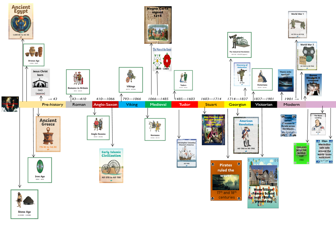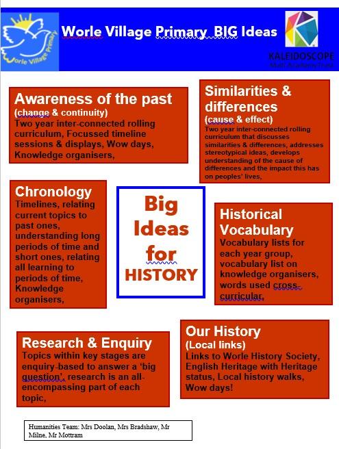 At Worle Village, we aim for a high quality history curriculum which should inspire in pupils a curiosity and fascination about Britain’s past and that of the wider world. Our teaching equips pupils with knowledge about the history of their local area and Britain and how it has influenced and been influenced by the wider world; know and understand about significant aspects of the history of the wider world like ancient civilisations and empires; changes in living memory and beyond living memory; learn about the lives of significant people of the past; understand the methods of historical enquiry and be able to ask and answer questions.