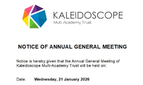 The Kaleidoscope Multi-Academy Trust Annual General Meeting (AGM) will be held on Wednesday 21 January 2026 at 6.00pm, at St Martin’s C of E Primary School, Spring Hill, Worle, Weston-super-Mare, BS22 9BQ.