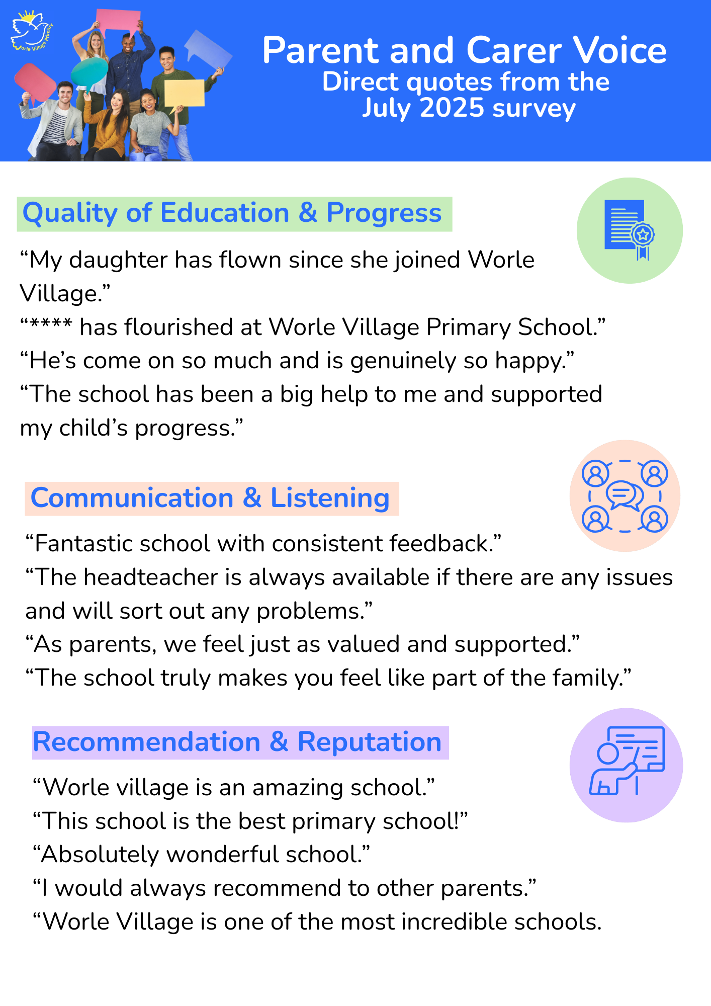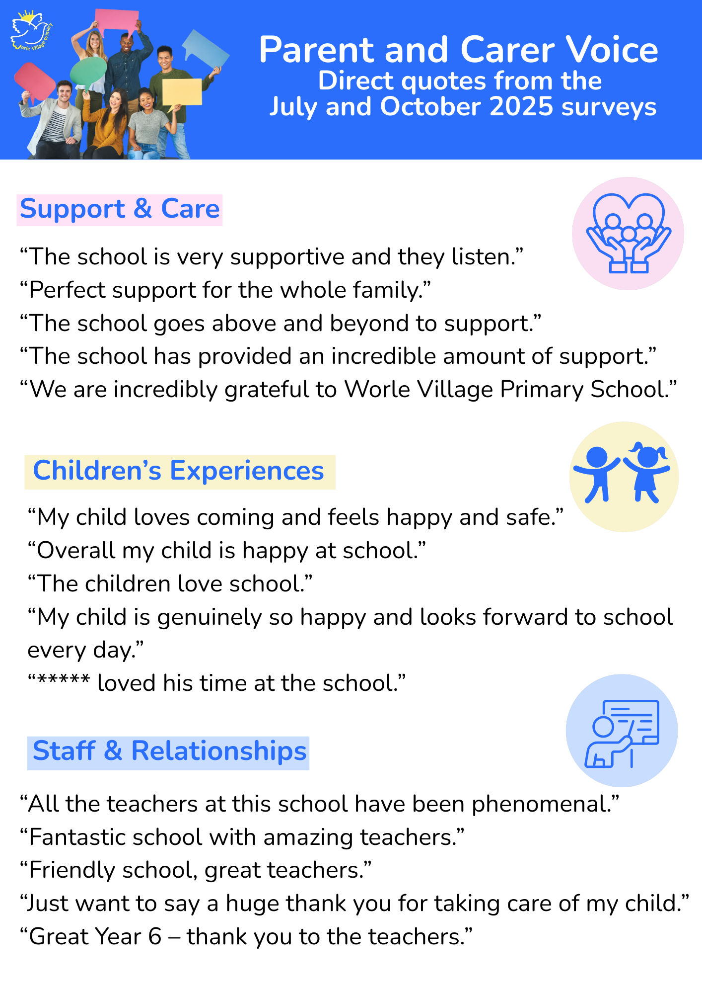 "Worle Village is one of the most incredible schools, all staff go above and beyond to support, give opportunities and ensure my children flourish. I couldn’t be happier with my experiences here, would always recommend to other parents."mm